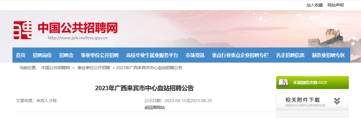 2023年廣西來(lái)賓市中心血站招聘編外聘用工作人員1人,報(bào)名時(shí)間:2023年8月15日至2023年8月20日,現(xiàn)將招聘公告原文發(fā)布如下: