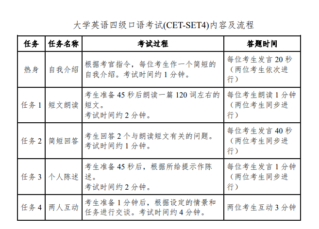 請?zhí)崆暗卿浫珖髮W(xué)英語四、六級考試網(wǎng)站(cet.neea.edu.cn),熟悉考試流程。2022下半年天津英語四級口語考試內(nèi)容及時間分配如下表所示: