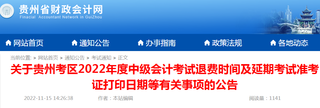 原文標(biāo)題:關(guān)于貴州考區(qū)2022年度中級會計(jì)考試退費(fèi)時(shí)間及延期考試準(zhǔn)考證打印日期等有關(guān)事項(xiàng)的公告