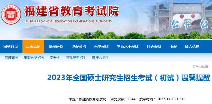 考研頻道從福建省教育考試院了解到,福建省2023年全國碩士研究生招生考試(初試)溫馨提醒已發(fā)布,詳情如下: