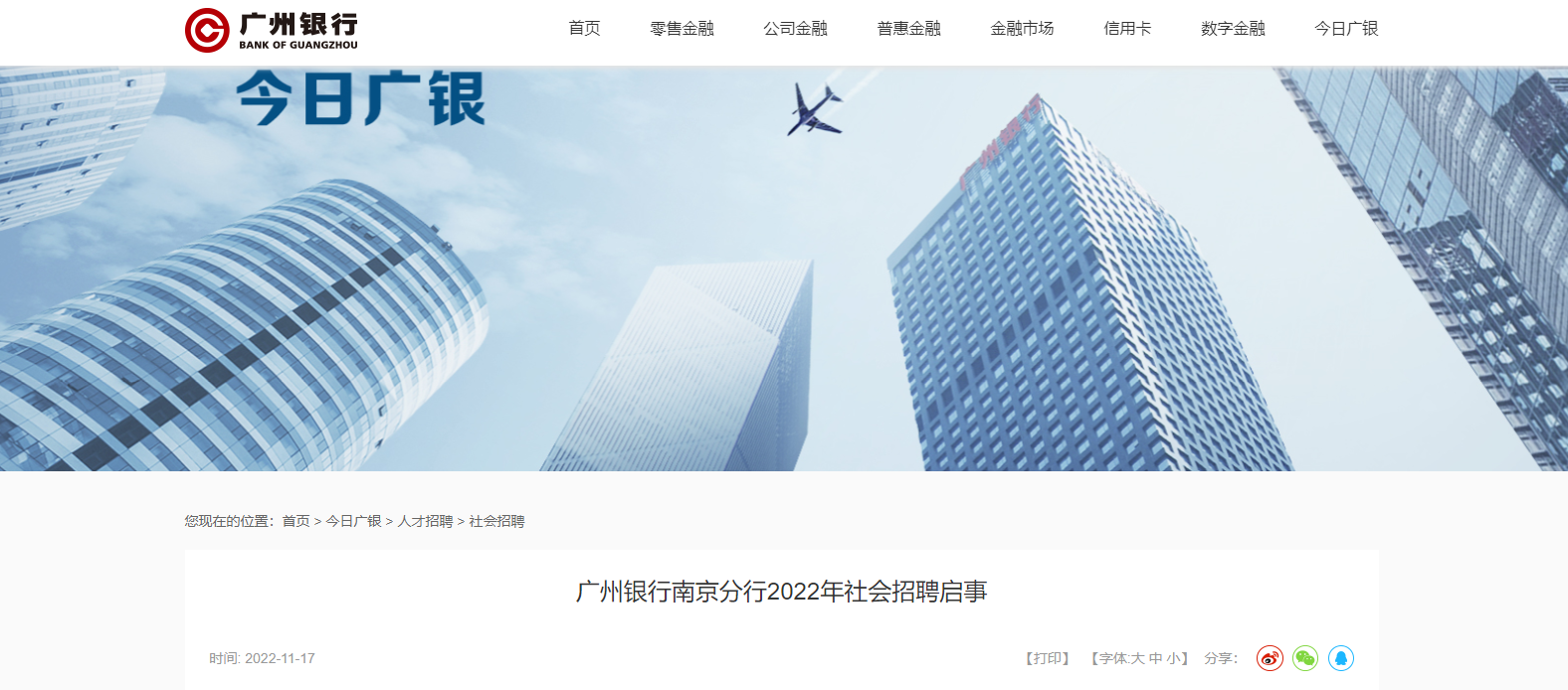 2022年廣州銀行江蘇南京分行社會(huì)招聘啟事已發(fā)布,現(xiàn)將招聘公告發(fā)布如下: