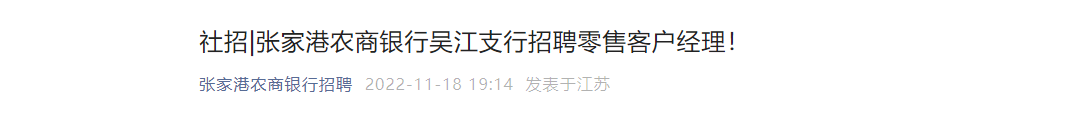 原文標(biāo)題:社招|張家港農(nóng)商銀行吳江支行招聘零售客戶經(jīng)理!