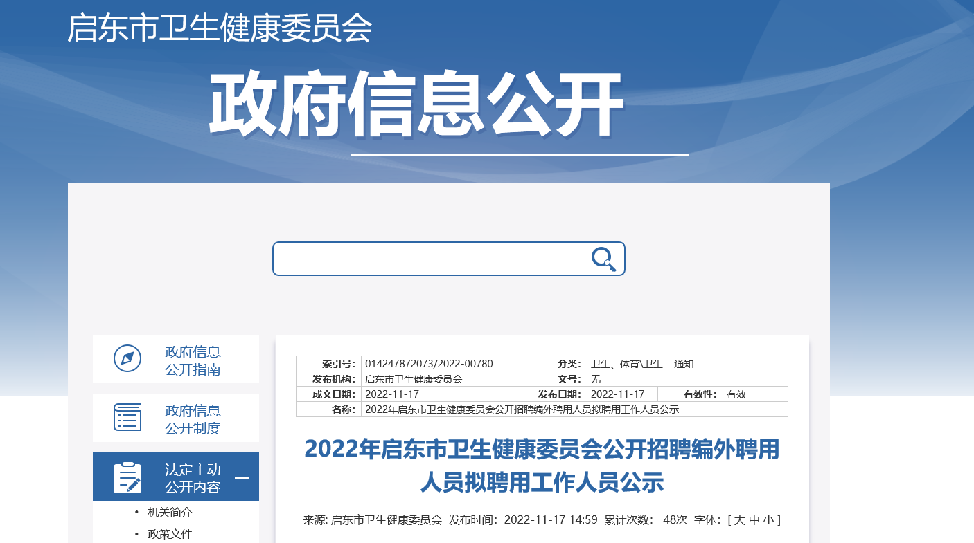 公示期限:2022年11月17日~11月25日。若對擬聘用工作人員有異議,可向啟東市衛(wèi)生健康委員會反映。