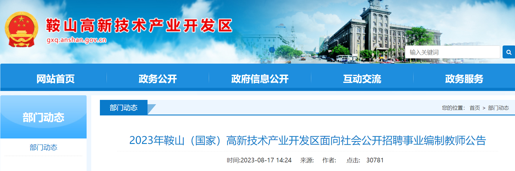 2023年鞍山(國(guó)家)高新技術(shù)產(chǎn)業(yè)開(kāi)發(fā)區(qū)面向社會(huì)公開(kāi)招聘事業(yè)編制教師人數(shù)、崗位簡(jiǎn)介、崗位要求等相關(guān)事宜通過(guò)鞍山高新技術(shù)產(chǎn)業(yè)開(kāi)發(fā)區(qū)網(wǎng)站查詢(詳見(jiàn)附件1)。