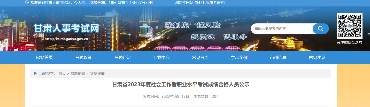 從甘肅人事考試網(wǎng)獲悉,2023年甘肅社會(huì)工作者職業(yè)水平考試成績合格人員公示,請相關(guān)人員仔細(xì)閱讀,具體詳情如下: