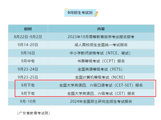 從中國教育考試網(wǎng)發(fā)布的《2023下半年全國大學(xué)英語四、六級考試報名工作啟動通知》、《2023下半年全國大學(xué)英語四、六級考試(CET)考生須知》、《2023下半年全國大學(xué)英語四、六級考試口語考試(CET-SET)考生須知》和廣東省教育考試院《2023年9月廣東招生考試日歷》、《關(guān)于做好2023年下半年廣東省全國大學(xué)英語四、六級考試報名工作的通知》以及廣東各院校發(fā)布的報考通知得知,2023下半年廣東英語四六級報名時間、條件、流程及入口已公布,9月18日-9月26日進(jìn)行報名,具體詳情如下: