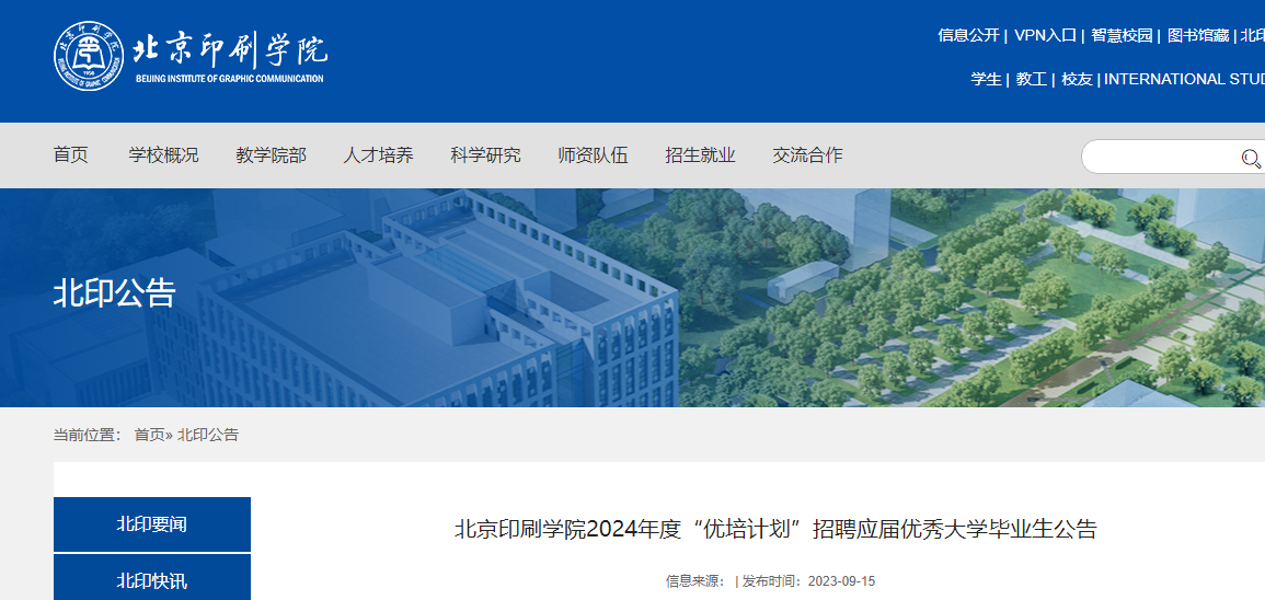 2024年度北京印刷學(xué)院“優(yōu)培計劃”招聘應(yīng)屆優(yōu)秀大學(xué)畢業(yè)生公告已發(fā)布,招聘出版?zhèn)鞑ハ嚓P(guān)專業(yè)教師1人,報名時間:2023年9月20日9:00至2023年9月27日18:00?,F(xiàn)將招聘公告原文發(fā)布如下: