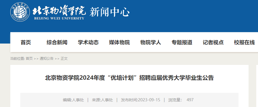 2024年度北京物資學(xué)院“優(yōu)培計(jì)劃”招聘應(yīng)屆優(yōu)秀大學(xué)畢業(yè)生公告已發(fā)布,招聘專(zhuān)業(yè)教師2名,報(bào)名時(shí)間:2023年9月20日9:00至2023年9月27日18:00?,F(xiàn)將招聘公告原文發(fā)布如下: