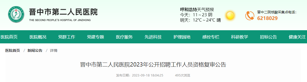 2023山西晉中市第二人民醫(yī)院招聘資格復審時間已公布,資格復審時間:2023年9月20日,上午8:00--12:00;下午15:00--18:00,現(xiàn)將招聘公告原文發(fā)布如下:
