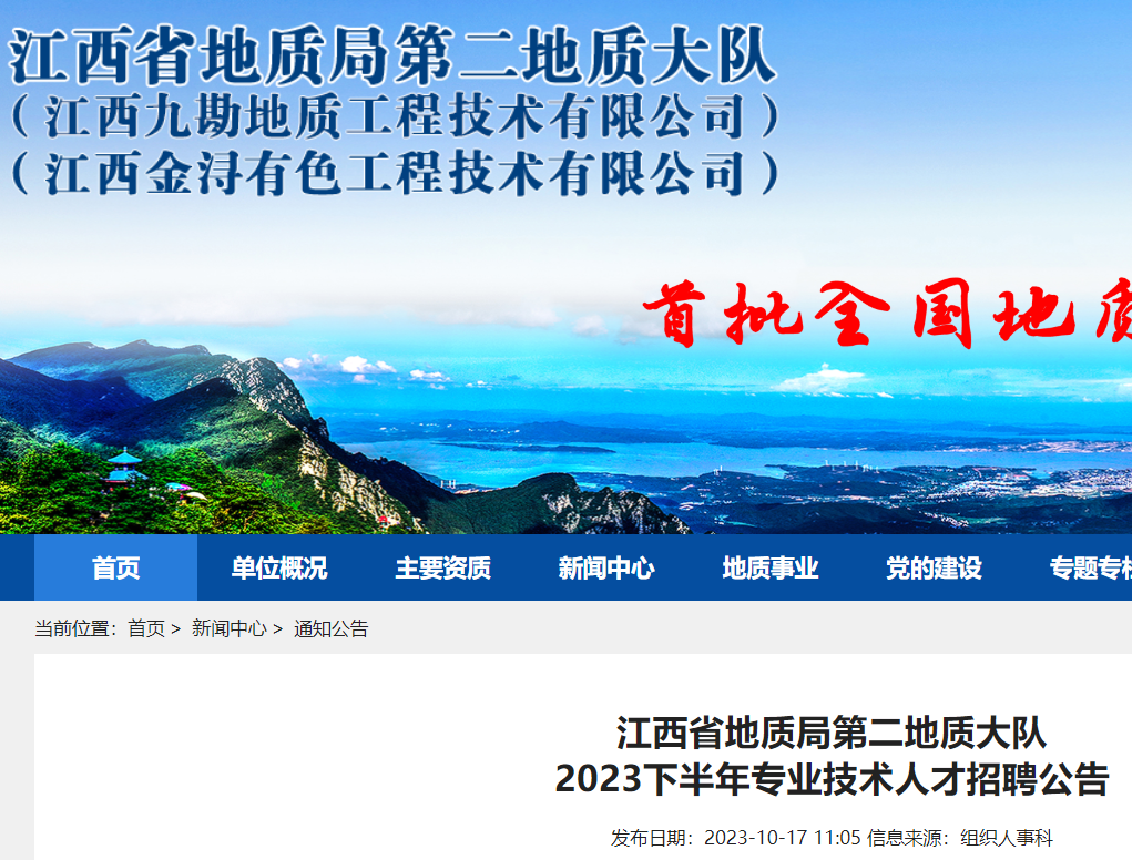 小編根據(jù)江西省地質(zhì)局第二地質(zhì)大隊發(fā)布”江西省地質(zhì)局第二地質(zhì)大隊 2023下半年專業(yè)技術(shù)人才招聘公告“得知,2023下半年江西省地質(zhì)局第二地質(zhì)大隊專業(yè)技術(shù)人才招聘報名時間公告發(fā)布之日起至2023年11月1日。