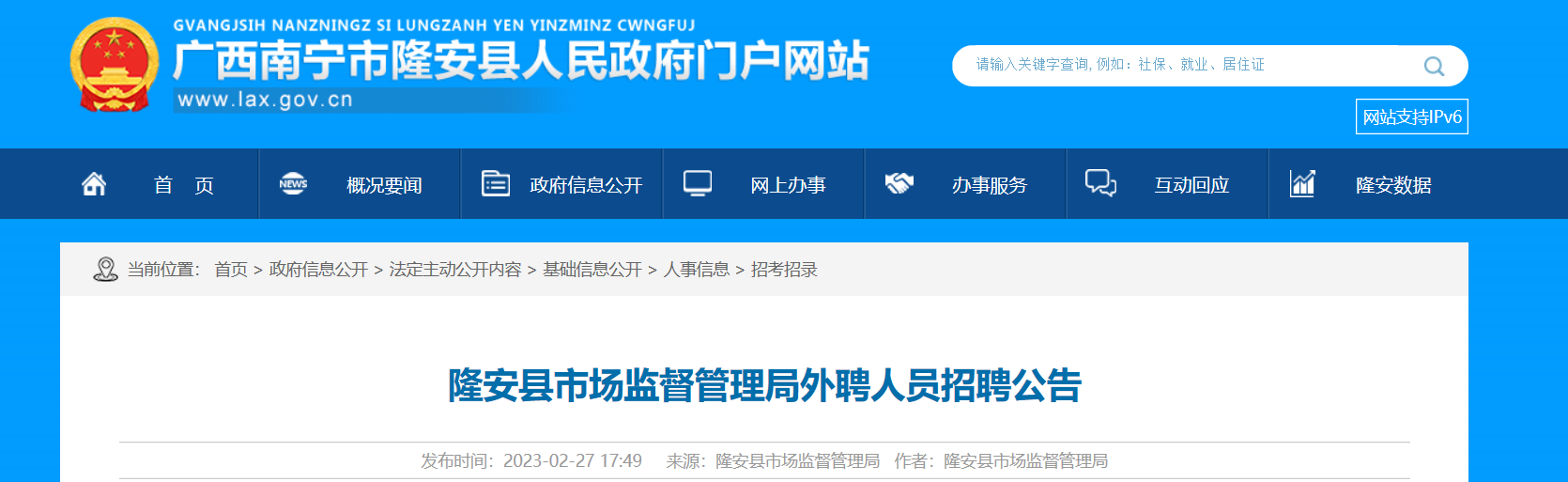 根據(jù)工作需要,隆安縣市場(chǎng)監(jiān)督管理局面向社會(huì)公開招聘外聘人員,現(xiàn)將有關(guān)事宜公告如下: