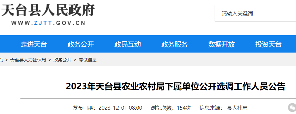 小編根據(jù)天臺(tái)縣農(nóng)業(yè)農(nóng)村局發(fā)布“2023年天臺(tái)縣農(nóng)業(yè)農(nóng)村局下屬單位公開(kāi)選調(diào)工作人員公告”得知,2023年浙江天臺(tái)縣農(nóng)業(yè)農(nóng)村局下屬單位選調(diào)工作人員6名,報(bào)名時(shí)間為2023年12月11日-13日。
