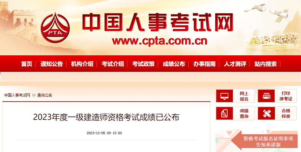 2023年四川一級(jí)建造師職業(yè)資格考試成績(jī)于2023年12月5日公布。請(qǐng)考生到中國(guó)人事考試網(wǎng)站“成績(jī)查詢”欄目進(jìn)行查詢。