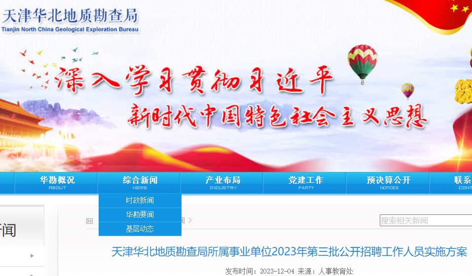 2023年12月4日—12月13日,在天津華北地質(zhì)勘查局網(wǎng)站(網(wǎng)址:http://www.ncge.cn/)和天津華北地質(zhì)勘查總院網(wǎng)站(網(wǎng)址:http://www.tjdkzy.com/)公布招聘方案,公告期間接收報名材料。