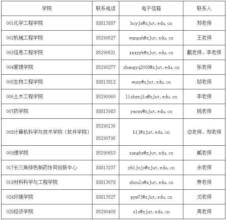 關(guān)于您所報考專業(yè)的具體問題可向各學(xué)院咨詢(區(qū)號0571):