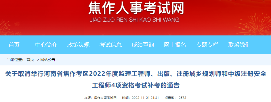 鑒于焦作市近期疫情防控形勢,為保證河南省焦作考區(qū)報考人員和考務(wù)工作人員身體健康和生命安全,經(jīng)綜合研判,決定取消原定于2022年11月26、27日舉行的2022年度監(jiān)理工程師、出版、注冊城鄉(xiāng)規(guī)劃師、中級注冊安全工程師4項資格考試補考,本年度不再繼續(xù)安排補考。已報名繳費的報考人員已繳考試費用統(tǒng)一安排退費(考試費用直接返還至原支付賬戶,退費工作最遲于本年度12月底前完成),考試合格成績實行滾動管理的,已取得的合格成績有效期延長一年。因取消補考給您帶來的不便,敬請諒解。