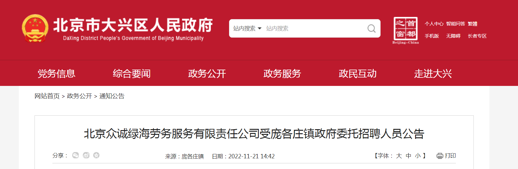2022年北京眾誠(chéng)綠海勞務(wù)服務(wù)有限責(zé)任公司受龐各莊鎮(zhèn)政府委托招聘人員公告已發(fā)布。報(bào)名時(shí)間:2022年11月22日至11月26日?,F(xiàn)將公告原文發(fā)布如下: