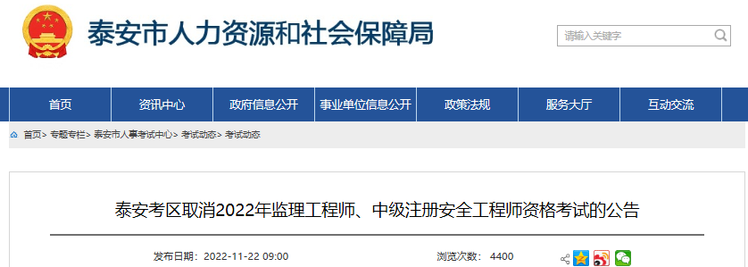 原文標(biāo)題:泰安考區(qū)取消2022年監(jiān)理工程師、中級(jí)注冊安全工程師資格考試的公告