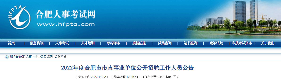 根據(jù)《事業(yè)單位人事管理條例》(國務院令第652號)、中共安徽省委組織部、安徽省人力資源社會保障廳《關于印發(fā)〈安徽省事業(yè)單位公開招聘人員暫行辦法〉的通知》(皖人社發(fā)〔2010〕78號)規(guī)定和要求,現(xiàn)就2022年度合肥市市直事業(yè)單位公開招聘工作人員有關事項公告如下: