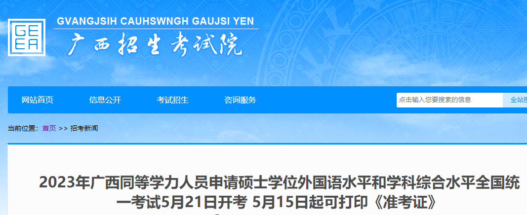 同等學力頻道從廣西招生考試院了解到,2023年廣西同等學力申碩考試5月21日開考,5月15日起可打印準考證。具體如下: