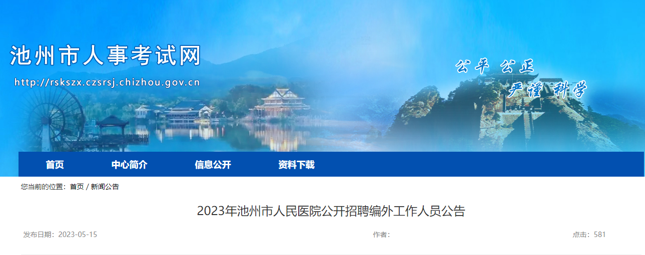本次招聘計劃為43名,不納入編制管理。招聘公告、崗位、條件等信息于2023年5月15日起在池州市人力資源和社會保障局網(wǎng)(http://czsrsj.chizhou.gov.cn)、池州市人事考試網(wǎng)站(http://rskszx.czsrsj.chizhou.gov.cn)、池州市人民醫(yī)院網(wǎng)站(http://www.chizhouhospital.com)等網(wǎng)站上發(fā)布。