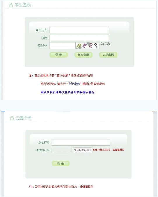 輸入身份證號,點擊“發(fā)送短信驗證碼”按鈕后,系統(tǒng)會發(fā)送驗證碼至考生報名時所填的手機號上;填寫完短信驗證碼,點擊“確定”,跳轉(zhuǎn)至考生修改密碼頁面,設(shè)置考生登錄密碼。請勿頻繁點擊“發(fā)送短信驗證碼”按鈕。