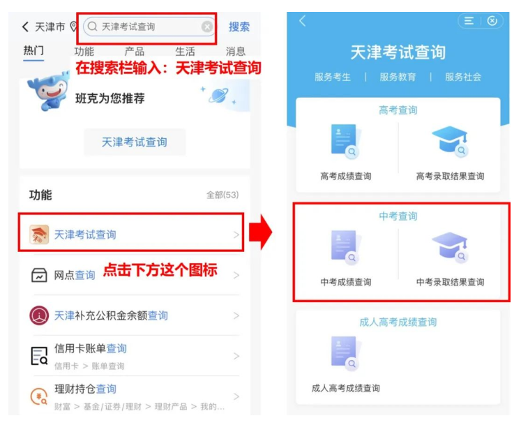 登錄建設(shè)銀行手機銀行APP后,可在首頁搜索欄輸入【天津考試查詢】,在下面的結(jié)果中點擊【天津考試查詢】,進入【天津考試查詢-中考成績查詢】頁面,即可進行查詢。