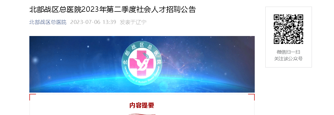 2023年遼寧省沈陽市北部戰(zhàn)區(qū)總醫(yī)院第二季度社會人才招聘,護理類報名時間為2023年7月11日8:00-17:00,現(xiàn)將招聘公告原文發(fā)布如下: