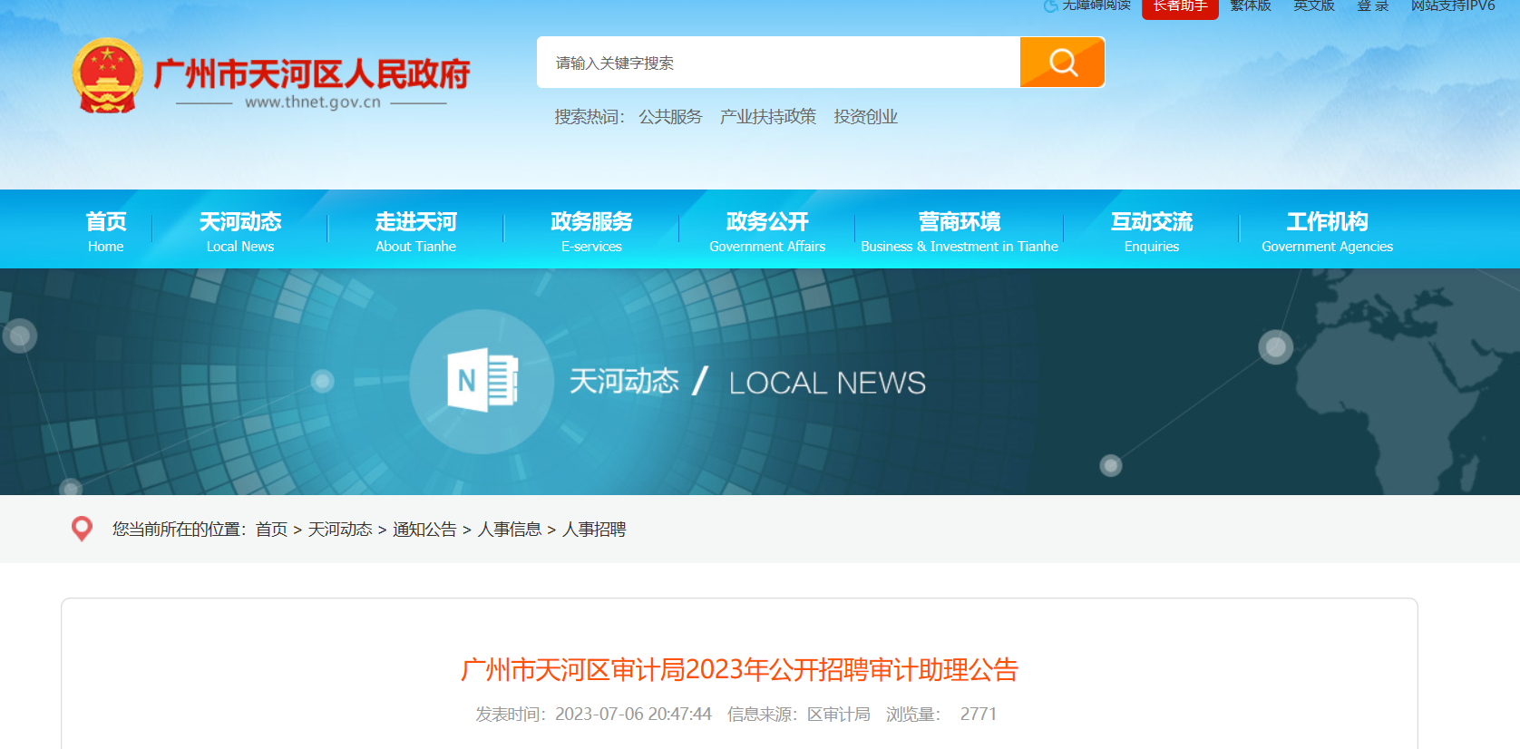2023年廣東省廣州市天河區(qū)審計(jì)局招聘審計(jì)助理1人。報(bào)名時(shí)間:2023年7月11日上午9:00時(shí)至2023年7月12日下午17:00時(shí)。現(xiàn)將公告原文發(fā)布如下: