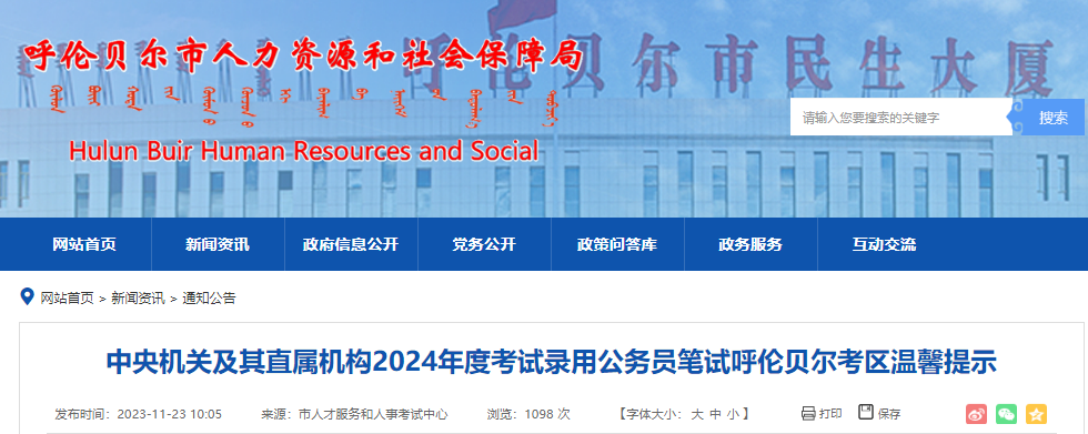 中央機(jī)關(guān)及其直屬機(jī)構(gòu)2024年度考試錄用公務(wù)員筆試呼倫貝爾考區(qū)考試將于11月26日舉行。為確保廣大考生順利參考,現(xiàn)將有關(guān)事項(xiàng)提醒如下: