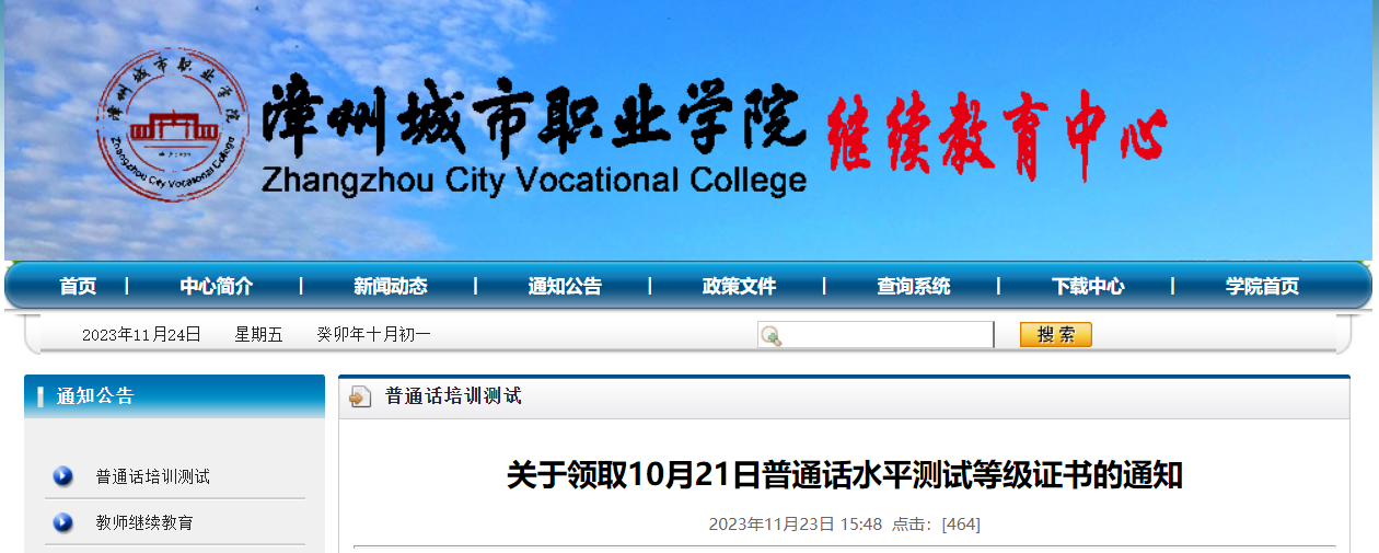 從漳州城市職業(yè)學(xué)院繼續(xù)教育中心獲悉,福建漳州市普通話培訓(xùn)測試站關(guān)于領(lǐng)取2023年10月21日普通話水平測試等級證書的通知已公布,具體詳情如下: