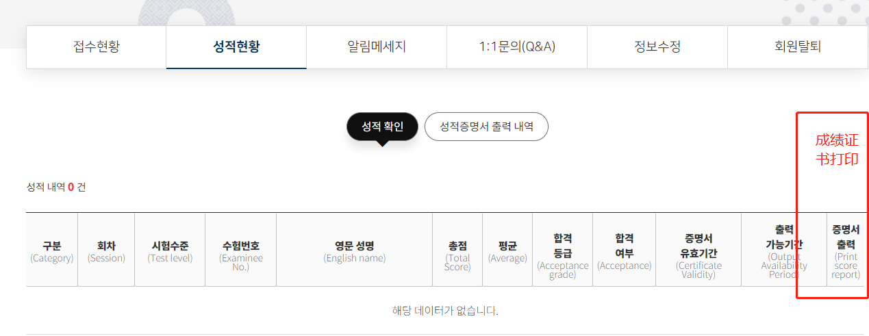 查到成績后,會出現(xiàn)歷屆參加考試的數(shù)據(jù),找到對應的那一屆,后面有一個증명서출력(打印證書),點擊即可。