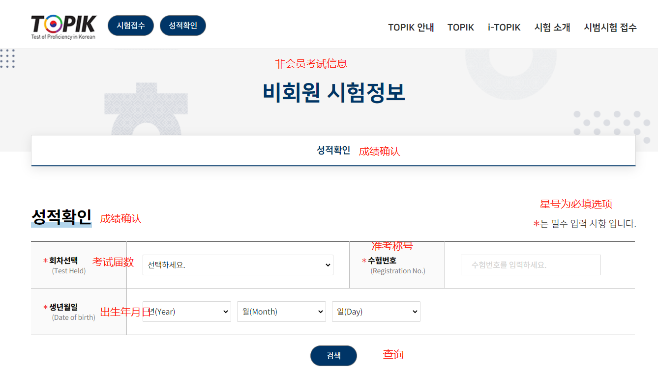 首先點擊회차선택(考試屆數(shù))對應的下拉菜單,選擇參加考試的屆數(shù);
