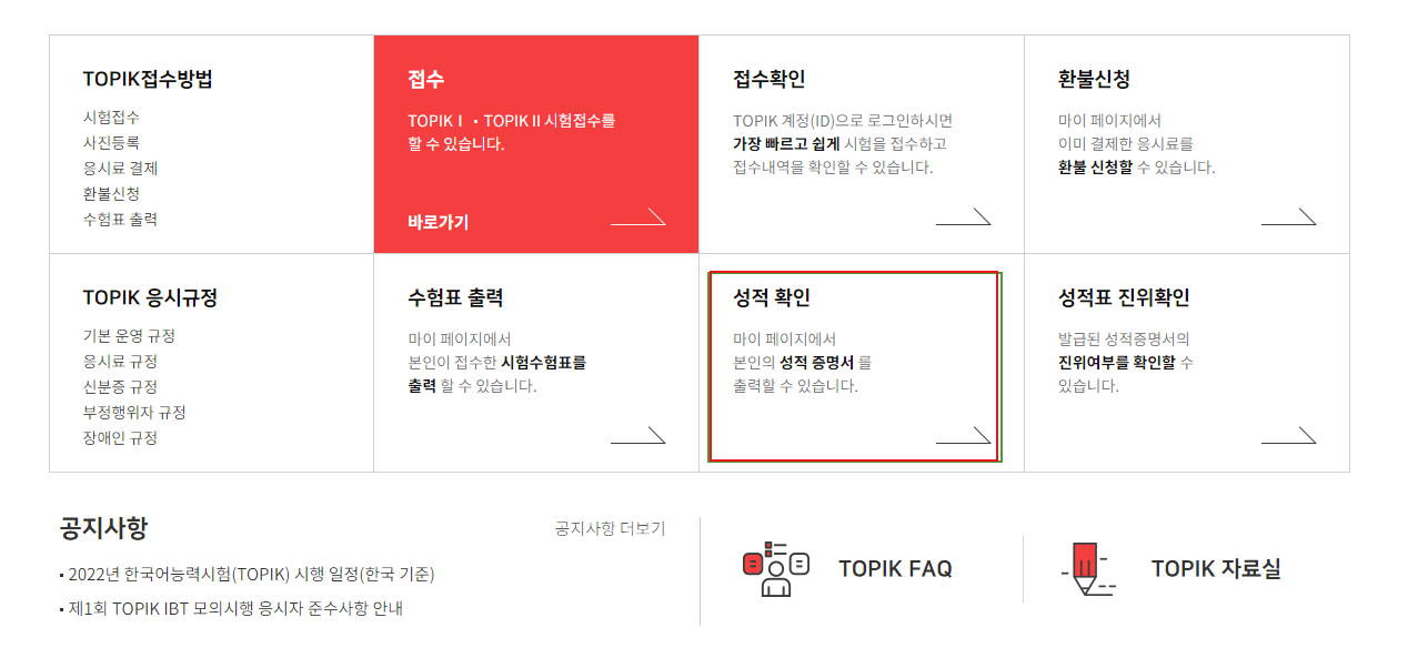 山東2022年10月韓國語能力考試成績查詢入口已開通,11月24日起,考生可自行在韓國語能力考試網(wǎng)(w w w . t o p i k . g o . k r)上查詢成績或打印成績單,不再發(fā)放紙質成績單,成績單2年內有效。丟失成績單或需補打成績單的考生,請在韓國語能力考試(w w w . t o p i k . g o . k r)上輸入個人的相關信息(準考證號、考試日、出生年月日)即可在線打印。打印的成績單與原紙質成績單具有同等效力。