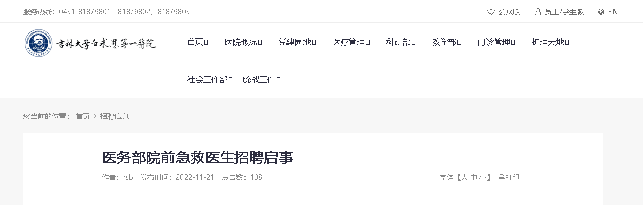 2022吉林大學白求恩第一醫(yī)院醫(yī)務部院前急救醫(yī)生招聘,報名時間:2022年11月30日下午15:30截止,現(xiàn)將招聘啟事原文發(fā)布如下:
