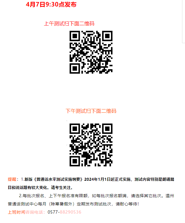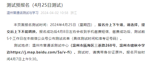 測試地點:溫州市普通話測試中心(溫州市甌海區(qū)三茶路268號,溫州市嘯秋中學邊https://j.map.baidu.com/5a/v-fi)。測試時,請攜帶身份證原件。報名開始時間4月7日上午9:30。