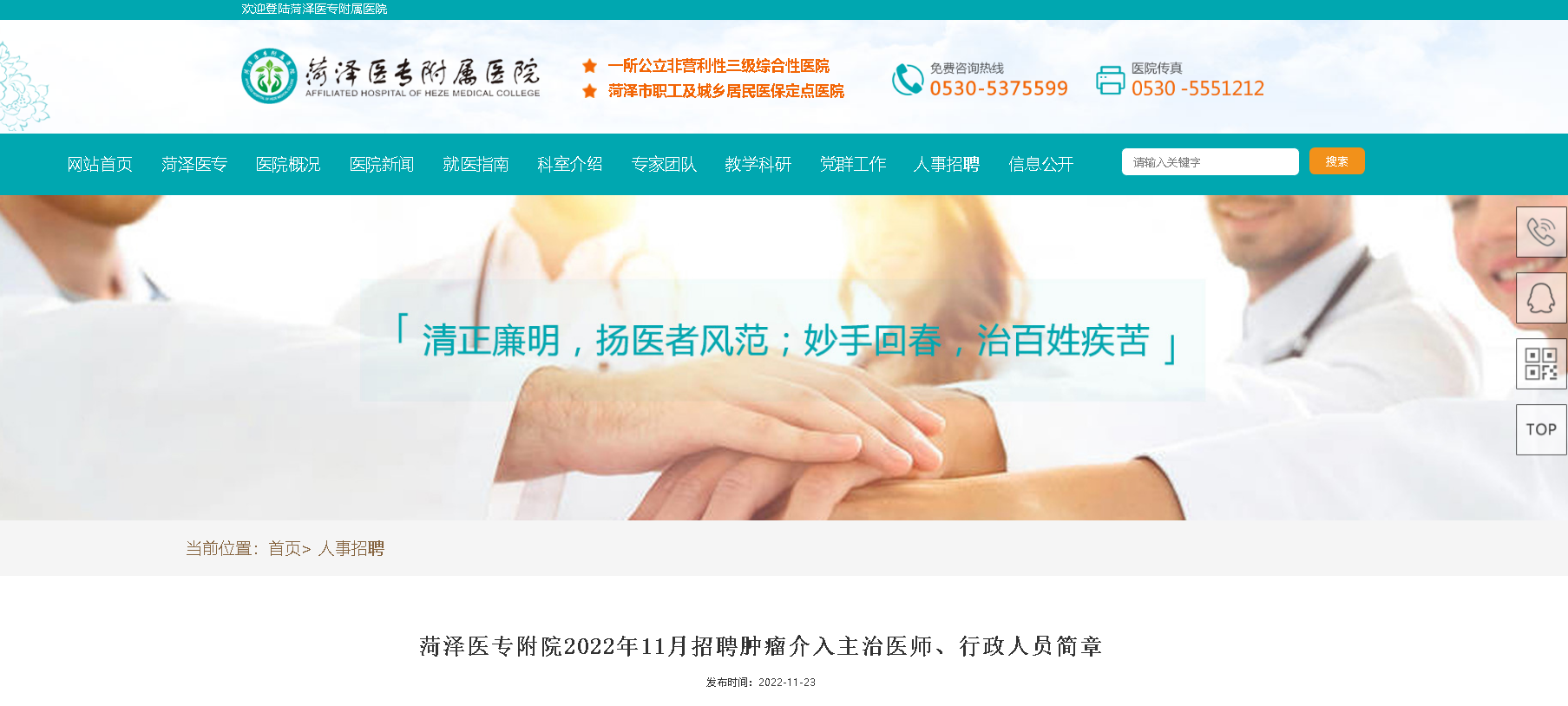 2022年11月山東菏澤醫(yī)專附院招聘腫瘤介入主治醫(yī)師、行政人員2人,報名時間:2022年11月23日至2022年12月1日,現(xiàn)將招聘簡章原文發(fā)布如下: