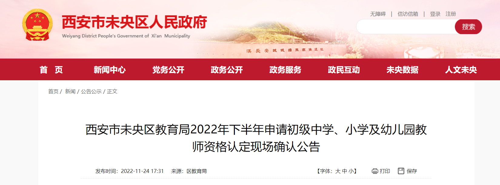 從西安市未央區(qū)人民政府獲悉,2022年下半年陜西西安市未央區(qū)申請初級中學、小學及幼兒園教師資格認定現(xiàn)場確認公告已公布,請相關人員仔細閱讀,具體詳情如下: