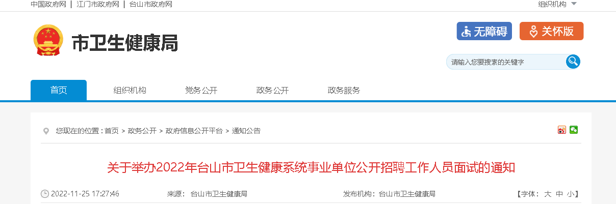 2022廣東江門市臺(tái)山市衛(wèi)生健康系統(tǒng)事業(yè)單位招聘面試通知已出,詳細(xì)請(qǐng)見文內(nèi),現(xiàn)將招聘通知原文發(fā)布如下: