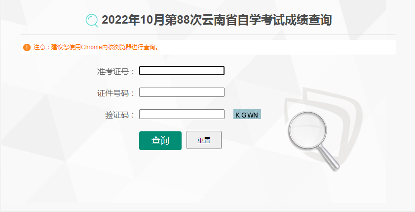 云南德宏2022年10月自學(xué)考試考生:進(jìn)入“云南省招考頻道”→找到“自學(xué)考試查詢”欄目→點(diǎn)擊“2022年10月成績(jī)查詢”→輸入“準(zhǔn)考證號(hào)”、“證件號(hào)碼”及“驗(yàn)證碼”等相關(guān)信息點(diǎn)擊“查詢”即可查詢成績(jī)。