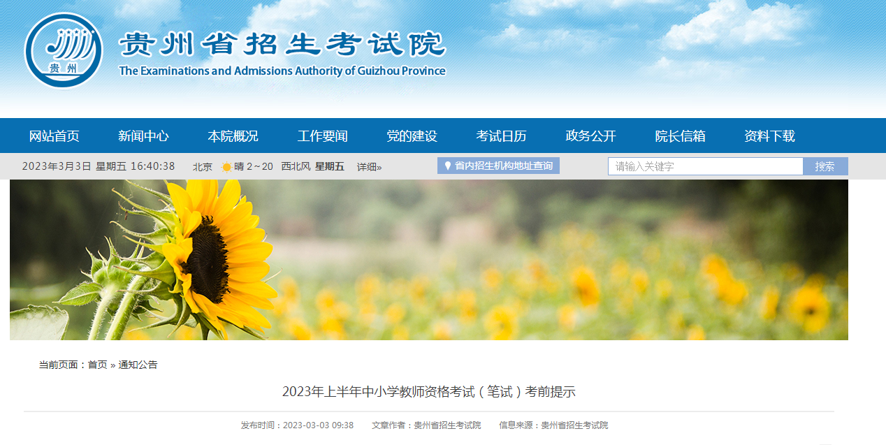 從貴州省招生考試院獲悉,2023上半年貴州中小學(xué)教師資格考試筆試考前提示已公布,3月6日起打印準考證,3月11日舉行考試,具體詳情如下: