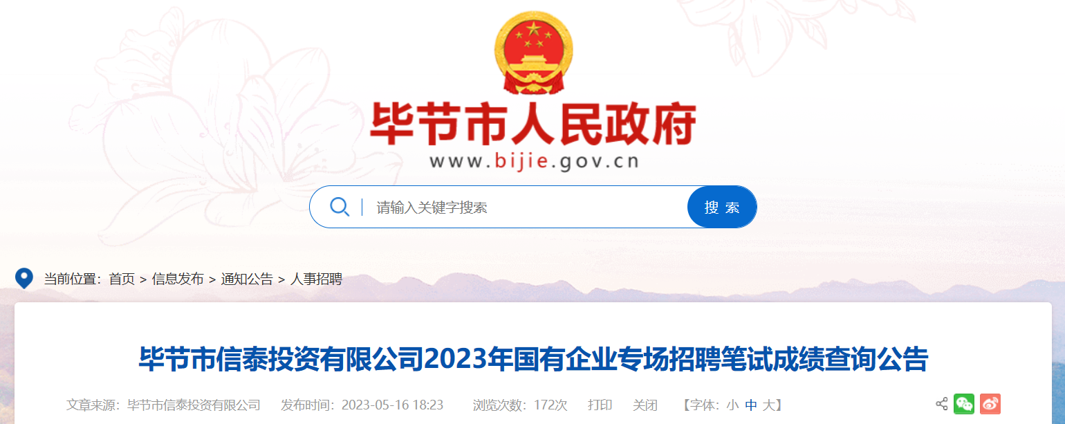 2023年貴州省畢節(jié)市信泰投資有限公司國(guó)有企業(yè)專場(chǎng)招聘筆試成績(jī)查詢公告。筆試成績(jī)查詢時(shí)間2023年5月16日至5月18日下午17:30,現(xiàn)將公告原文發(fā)布如下: