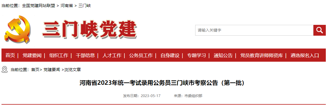 (四)河南省2023年統(tǒng)一考試錄用公務(wù)員三門(mén)峽市考點(diǎn)有關(guān)信息,均通過(guò)三門(mén)峽黨建網(wǎng)(http://www.smxdj.cn/)發(fā)布,請(qǐng)考生及時(shí)關(guān)注查詢。