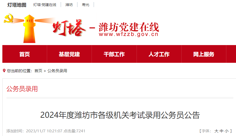 從燈塔-濰坊黨建在線獲悉,2024年山東濰坊市各級機(jī)關(guān)考試錄用公務(wù)員,報名時間:2023年11月10日-13日,考試時間:2023年12月10日,更多事宜請參考閱讀《考試公告》,官方公告原文如下: