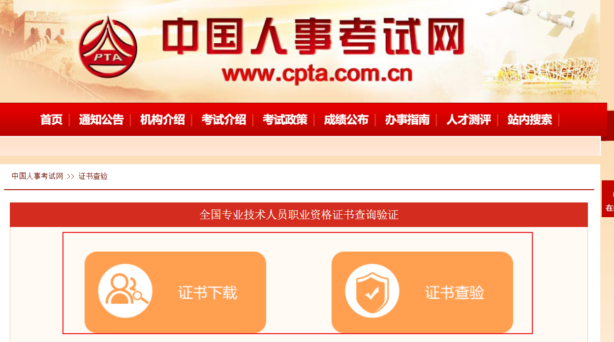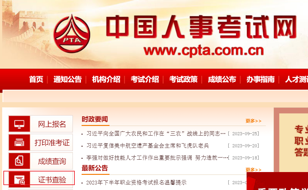 訪問中國人事考試網(wǎng)(www.cpta.com.cn)首頁,點擊左側(cè)菜單中的[證書查驗]。