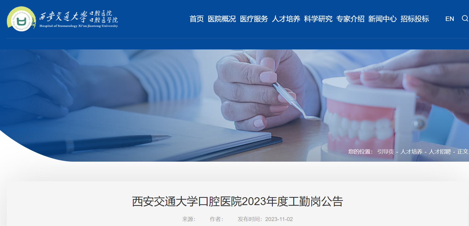 2023年陜西西安交通大學口腔醫(yī)院工勤崗招聘公告已發(fā)布,報名時間:即日起-2023年11月16日?,F(xiàn)將招聘公告原文發(fā)布如下: