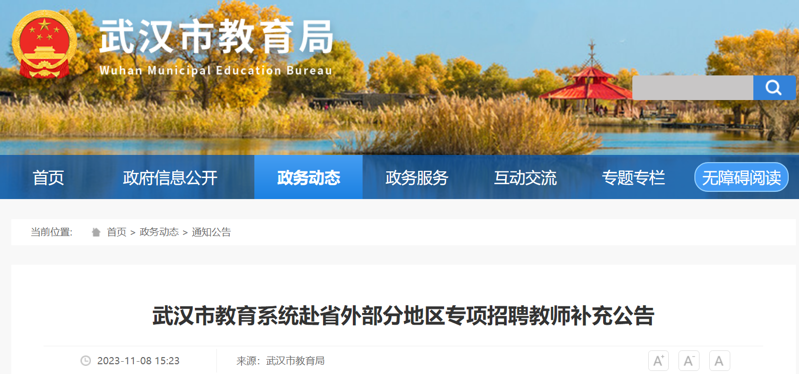 2023年湖北武漢市教育系統(tǒng)赴省外部分地區(qū)專項招聘教師補充公告已發(fā)布,現(xiàn)將公告原文發(fā)布如下: