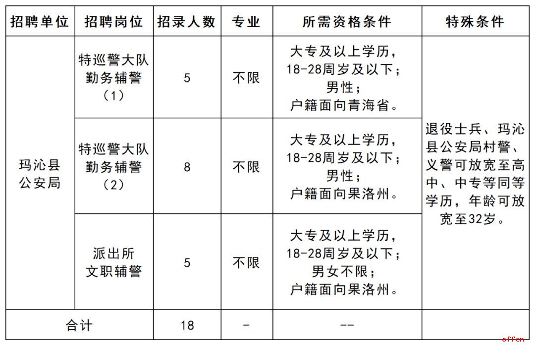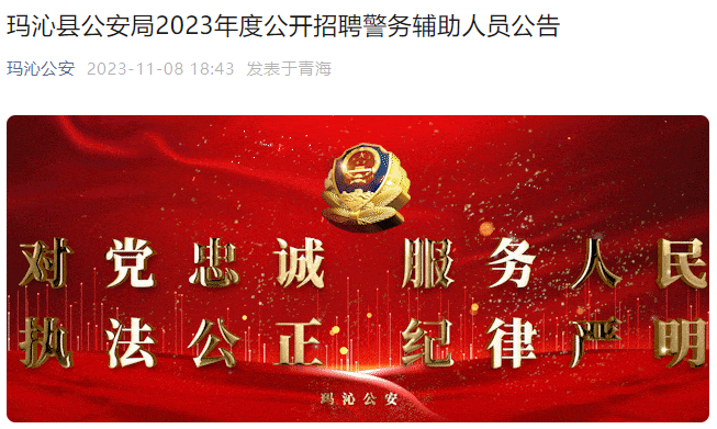 從瑪沁公安了解到,2023年青海果洛州瑪沁縣公安局招聘警務輔助人員18人,相關事宜詳情如下: