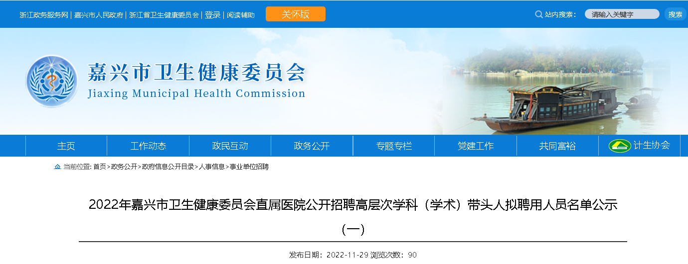 2022年浙江嘉興市衛(wèi)生健康委員會直屬醫(yī)院公開招聘高層次學(xué)科(學(xué)術(shù))帶頭人擬聘用人員名單公示(一)已出,公示時間:2022年11月29日起到12月7日,現(xiàn)將招聘公示原文發(fā)布如下: