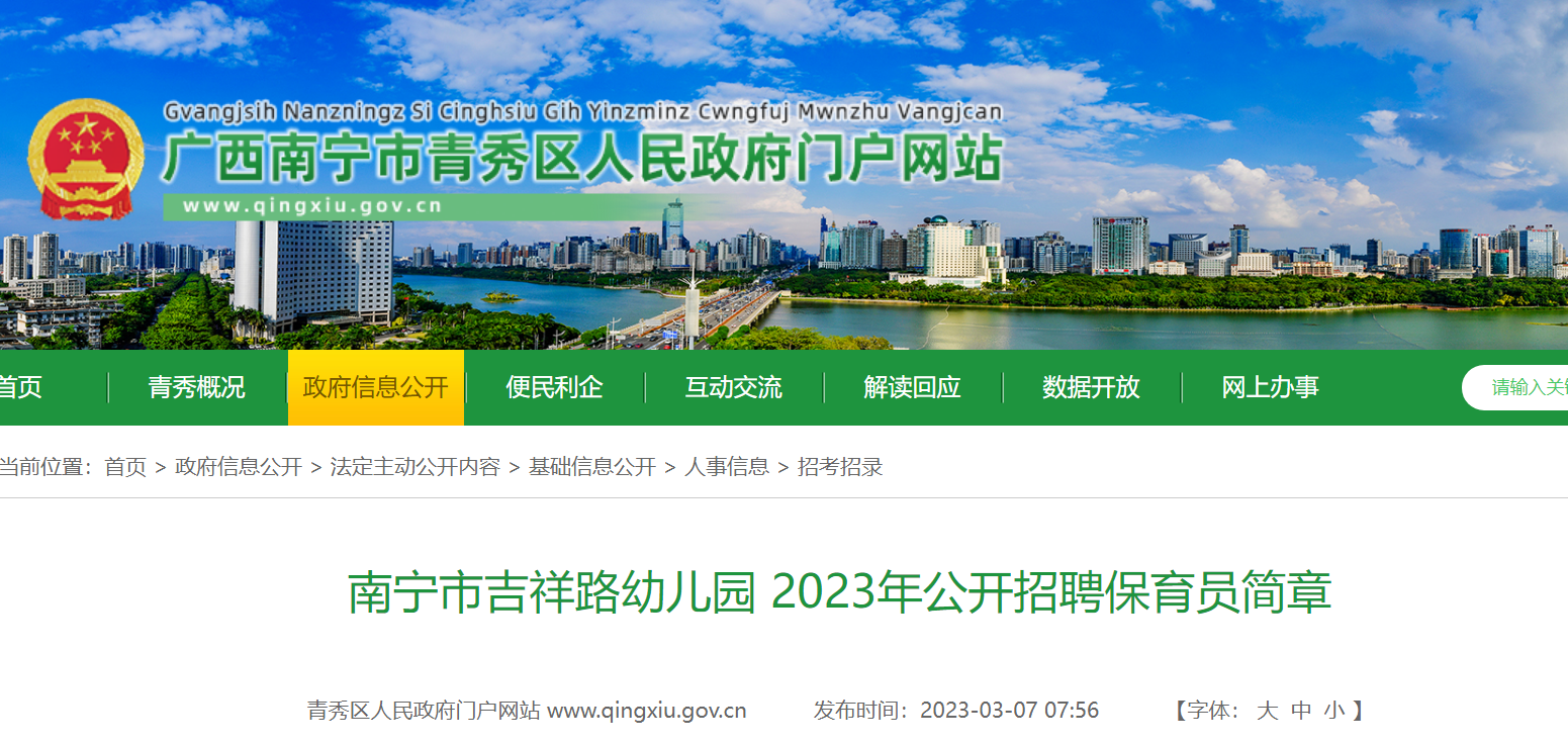 2023廣西南寧市吉祥路幼兒園招聘保育員1人,報名時間:2023年3月7日—3月31日?,F(xiàn)將招聘公告原文發(fā)布如下: